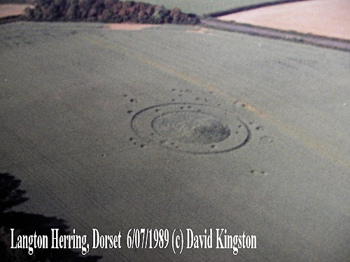 Crop Phenomena Research, The Bungalow, Penwithen, Winterborne Monkton, Dorchester, Dorset DT2 9PS Telephone 01305 266832 8th July 1989 Survey report on Langton Herring crop circle in Dorset. Crop: Wheat Discovered on: 6th July 1989 after report from farm labourer John Hilear. Unusual happenings: John Hilear reported that his dogs woke him up at 3.30am on the morning of the 6th July and he heard a strange buzzing, crackling noise. I spotted strange lights, balls of light, over the field whilst taking photographs from a microlight. Circle Dimensions: The main circle was 240 feet across, measured to the outer ring. There were 22 small circles, grapeshot, measuring in size from just six inches in diameter to 2feet in diameter. The whole of this crop circle formation had no broken or damaged crop in it and there was no sign of human entry until John and myself entered the circle.
