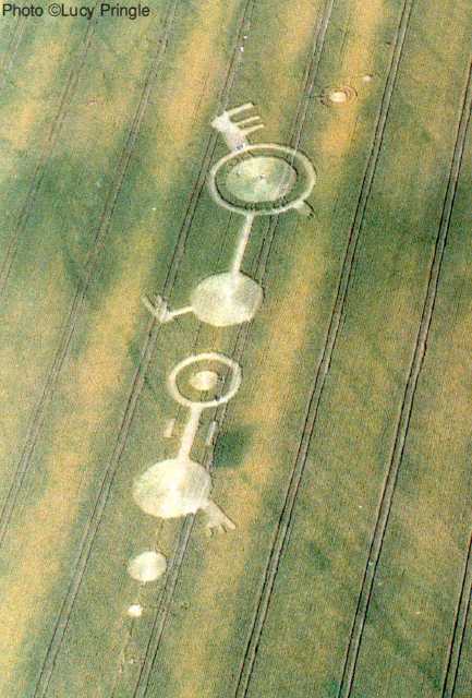 Alton Barnes back in 1990 was your normal Rural sleepy picture postcard village in Wiltshire, it was situated at that time slightly away from the Crop Circles haunt, some two miles south of Avebury, on the borders of the Vale of Pewsey. Not a lot went on, but on the 13th of July 1990 all of that was to change, as this 400+ft long pictogram was to put Alton Barnes on the map, and to probably make it the most famous village in the world! If you weren't able to visit this pictogram set within a natural amphitheatre, surrounded by Ancient Sites as Adam's Grave and Knapp Hill, then I would like to try and describe the events that surrounded this amazing formation at that time. The appearance of the pictogram took everyone by surprise, no one could have predicted a shape of this complexity and originality, the formations that had appeared in the immediate area at that time, were still resembling the designs of the late eighties, but here was something different from the norm, and was to capture the world's imagination. Tim and Polly Carson are the Farmers of East Field and the surrounding land, but this was there first Crop Circle they had experienced on their Farm, and naturally they were excited about the event. Polly drove up the sloping road towards Napp Hill on the early hours of July 13th to view the formation, and was overcome by the shear scale of the design. She felt that a phone call was in order to try and find some experts to view the formation for themselves and called the local paper. By chance the lady on the phone knew of Colin Andrews and gave her his number. Well as you can imagine it literally spiralled from that point, and many of the leading researchers were astounded by its appearance, and its overall construction.
