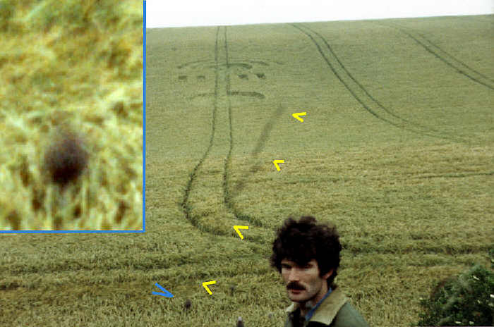 In the foreground is the farm employee who first discovered the crop formation behind him.