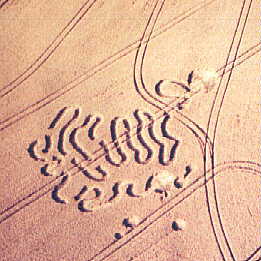 An extraordinary formation appeared in a remote location high above the village of Froxfield. It could only be viewed from the air, and was out of site from any major roads, the only access was down a shady dark footpath even then it was only just visible from the gate. Due to it's unsociable location it was kept in pristine condition, but only lasted for five days because of the time in the season. You can see why it was given the name "The Brain", but it's now been associated with the structure of our own DNA viewed under Ultra Violet. Ten different sections make up the whole design, it was the first time we had seen anything like this, and has never been duplicated since. An aerial shot by George Wingfield Copyright 1991. |