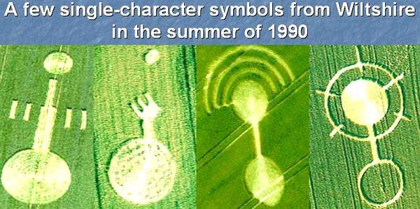 | Silbury Hill 1992: a modern "Rosetta Stone" by which to decode crop language glyphs from the 1990's In the spring of 1990, dozens of strange language glyphs suddenly and unexpectedly filled the English fields near Wiltshire. At first in May and June, only single-character symbols appeared But by July or August, a whole series of multi-character symbols had appeared, for example at Alton Barnes on July 12. A few of those single-character symbols are shown below: