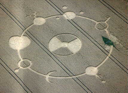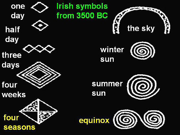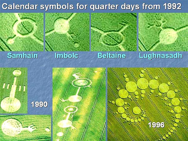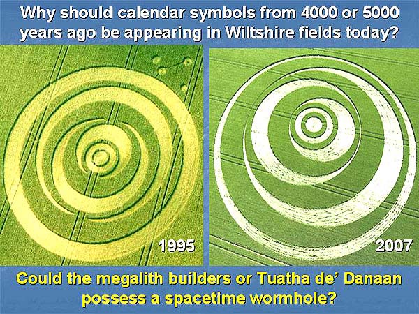 Even to this day, no one knows what any of them might mean. Before 1990, only a few single-character symbols had appeared, for example a quintuplet known as the Celtic Cross (see below). Then after 1990, other multi-character symbols sometimes appeared, but only sporadically as say at East Field on June 12, 1999. None of those strange symbols matched apparently any written script ever used on Earth. Who could have made them, and why? Other pictures in later years showed long-forgotten aspects of British megalithic astronomy When police detectives wish to solve a important case, usually they hold details of a crime scene back from the public. Then when someone later "confesses", they will more easily be able to sort out the true criminals from a much greater number of publicity-seeking frauds. The same holds true for crop pictures. If some of those pictures tell us something that hardly anyone else could know, except for a small group of individuals who possess some special or arcane knowledge, then maybe that small group designed and constructed the pictures in question? Early researchers found that new crop pictures would often appear close to ancient megalithic sites in Wiltshire: for example Avebury Ring, Stonehenge, Windmill Hill or Wayland's Smithy. More recently, we have confirmed the correctness and importance of those early observations, by finding that many complex crop pictures from the years 1996 to 2007 show long-forgotten aspects of megalithic astronomy, as practiced in the British Isles 4000 to 5000 years ago. Who else could know, except for the original builders of those megalithic sites? It took great effort just to reconstruct what those crop pictures were trying to tell us. Some show ancient yearly sundials ("Four megalithic sundials"). Others show lunar cycles as kept at Avebury Ring in the distant past ("The 1994 Avebury spiderweb"). Others show lunar phase diagrams ("The Stonehenge code" or "Dual codes for lunar astronomy at Chisledon"). Others show megalithic yearly calendars that have not been in use since 1000 BC ("SETI beneath our feet"). Occasionaly such astronomical crop pictures even contain geographical or historical information, telling precisely where or when they were made. Most correspond to northern latitudes of 51 to 60 degrees, thereby matching Stonehenge, Avebury or southern Norway. A few correspond to a historical era 4000 to 5000 years ago, when seasons on Earth were of slightly different length than today. Legends of out-of-place, high technology as possessed by the megalith builders or Tuatha de' Danaan Historical records suggest that the ancient megalith builders or "Tuatha de' Danaan" did indeed live in southern Norway, before they migrated to Ireland and England around 2000 BC. While in Norway, they were regarded as great teachers of science and knowledge. When they arrived in Ireland, they supposedly brought with them four out-of-place technological artefacts: the "Spear of Lugh" (an intensely hot weapon), the "Sword of Light" (a cutting laser), "Dagda's Cauldron" (an automated food supply), and the "Stone of Fal" (a device that could measure personal identity). Later around 1800 BC, after they lost in battle to invading Milesians from Spain, some of those Tuatha supposedly left through an underground "Gate to the Otherworld" and were never seen again. Might their legendary Gate to the Otherworld be what modern physicists call a spacetime "wormhole"? And by using such a device, could some of them be sending messages far forward in time, which we then perceive as modern crop pictures today? Astronomical or calendar symbols from the British Isles 4000 to 5000 years ago With those strange ideas in mind, I next re-examined many crop pictures from 1985 to 2005, in order to see whether any of them might show astronomical or calendar symbols from the British Isles 4000 to 5000 years ago? Some of those ancient symbols are shown below (from www.mythicalireland.com/astronomy/astroart/index.html):