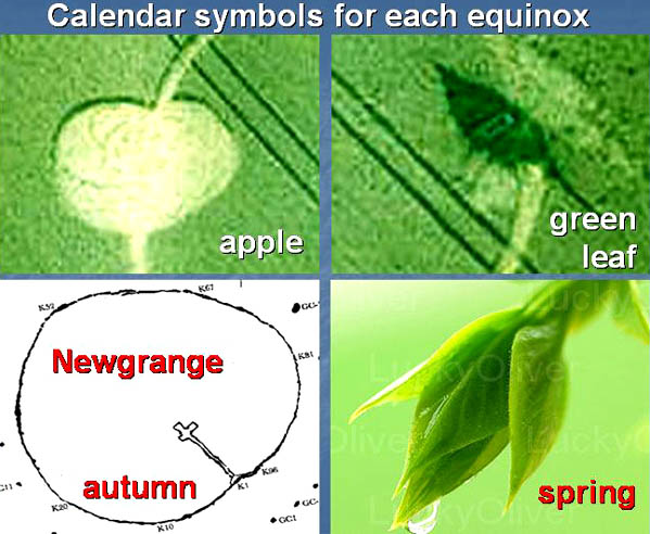Likewise, their symbol for "autumn equinox" (left) could represent some kind of ripe autumn fruit, say an apple. Yet it also matches an overall plan for Newgrange which was built during the same era. Could Newgrange have been designed to match certain symbols from the eight-part megalithic calendar? Ancient symbols for cross-quarter days Now onto the heart of this essay, which concerns a close resemblance between those four cross-quarter-day symbols, shown in crops at Silbury in 1992, and crop language glyphs from the summer of 1990. We cannot know for sure what each cross-quarter-day symbol represents, but can make reasonable guesses: