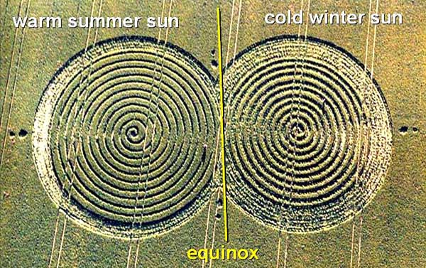 Thus any eight-part year may divided first into four nearly-equal parts, that will be centered on a summer solstice, autumn equinox, winter solstice or spring equinox respectively (labelled with red squares). Based purely on astronomy, one might then expect any cultural symbol for "summer solstice" to be a "bright full Sun", while any cultural symbol for "winter solstice" would be a "dim crescent Sun" as shown above. Indeed, that was what the crop artists drew at Silbury Hill in 1992. Their calendar symbol for "summer solstice" (left) was a "bright full Sun" surrounded by three smaller circles, that could plausibly be meant to represent the Moon. Likewise, their calendar symbol for "winter solstice" (right) was a "dim crescent Sun":