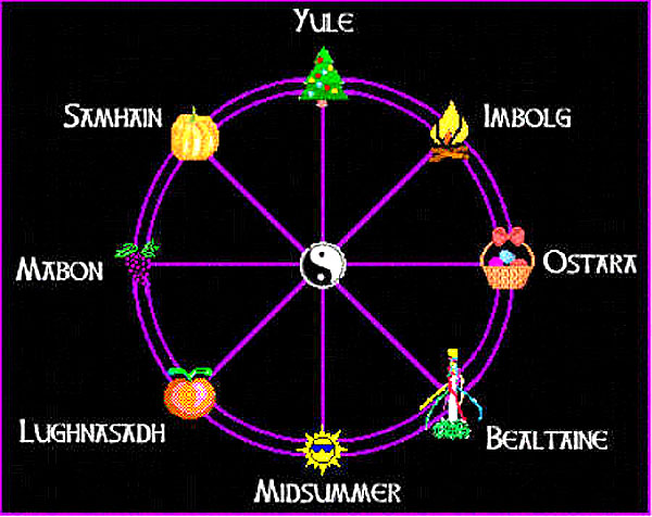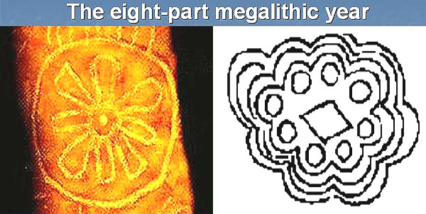 Pictures like this may be found all over the web, as the descendants of those tall, blond megalith builders who now live in faraway places like California or Australia try to rediscover their ancient roots. Our modern cultural symbol for "midsummer" seems clear enough as a bright Sun. But could we easily explain why a decorated fir tree symbolizes "Yule", or why a pumpkin represents "Samhain"? Ancient symbols for each solstice or equinox Now back to that eight-part calendar in crops. When we divide any solar year into eight nearly-equal parts, then its astronomy becomes as follows: