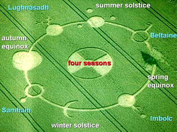 At its centre we can see the usual, checkered "four seasons" symbol (labelled here in red). Then around its outer perimeter, we can see eight other characteristic symbols, that represent the eight parts of any British megalithic year. Four of those (labelled in white) are just the summer solstice, autumn equinox, winter solstice or spring equinox. Four others (labelled in blue) represent "cross quarter days", namely Beltaine, Lughnasadh, Samhain or Imbolc, that lie between any solstice and its nearest equinox. All show a graphical style that closely resembles those crop language glyphs from the summer of 1990. A contemporary version of the same eight-part yearly calendar has become popular in recent years among Celtic culture enthusiasts: