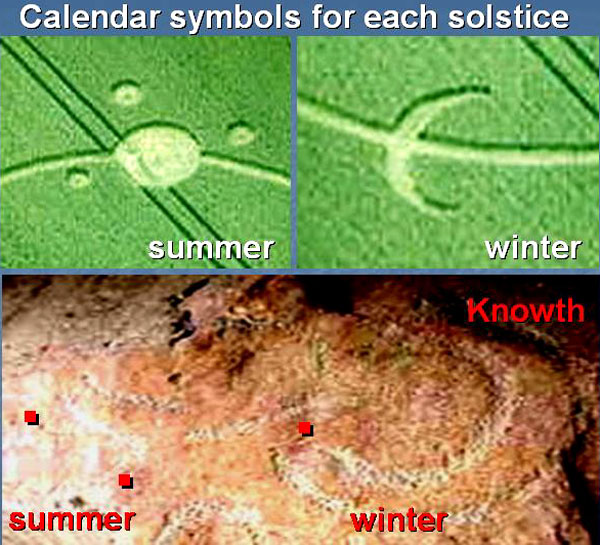We can also see a close match of both summer and winter solstice symbols as drawn in crops in 1992, to rock carvings made at Knowth in Ireland 5000 years ago. The ancient rock symbol there for "summer solstice" is a bit hard to see due to its extreme age: but look carefully for a thin circular line, with three small circles (labelled with red squares) on its outer perimeter. The ancient rock symbol for "winter solstice" was just a "dim crescent Sun". Next we may compare that crop symbol for "summer solstice" as drawn at Silbury Hill in 1992, with other crop language glyphs from earlier years; only to find that it matches well the "Celtic Cross" pictures found at Beckhampton on August 3, 1988, Warminster in July of 1990, and Morgan's Hill on May 28, 1990: