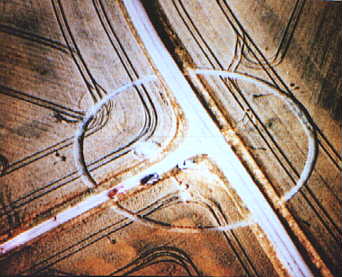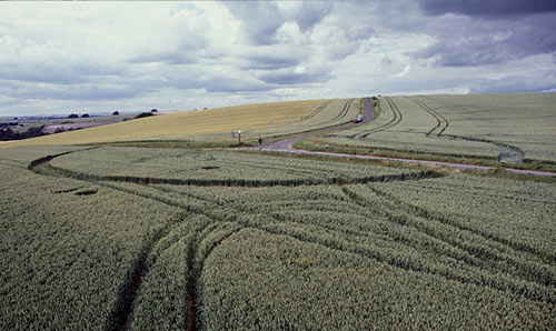 An unusual ring turn up on the same night as the Three Scrolls. In fact this ring was one of three formations located only yards apart from each other on the top of Lurkley Hill. The ring was placed directly around a road junction which led to the village of West Overton. Many Grapeshot circles accompanied the ring, situated randomly around it, some of them were only half a metre in diameter. |