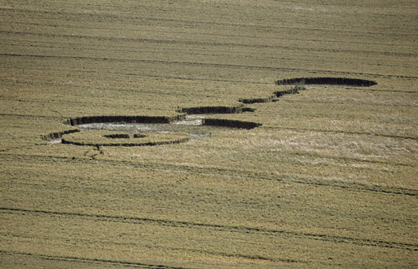 Telephoto shot taken the top of West Overton Hill. This formation had an additional circle at the rear, this appeared passed the standing rape seed plant, which was growing independently within the wheat field. |