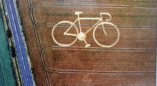 I have listed one crop circle in form of a bike. This was as an advertisement for the "81th Tour De France" which had two stages in England (twenty years after the tour first visited).Stage 4, Dover to Brighton on 6th July and Stage 5, around Portsmouth on 7th July 1994. The crop circle was was located at Cheesefoot Head, Hampshire and discovered/reported on July 8th in 1994. it's mentioned in Paul Vigay's ccdb at cropcircleresearch.com and in the Andrews Catalogue at number T 0331. I guess there is a photography in Colin Andrews book: "Crop Circles, Signs of Contact". Here's my link to the bicycle CLICK HERE