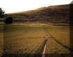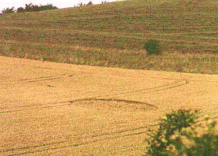 On the 25th of July we drove past Cley Hill but could not find the crop circle. During the Crop circle Conference at Glastonbury we told Busty Taylor and Steve Alexander about this circle but neither of them knew anything about it. On the 29th of July we decided to climb Cley Hill and there it was: a simple circle at the bottom of Cley Hill and nobody seemed to have been in it yet! All of the stems had started to grow up again. In the centre a lot of the standing stems were broken not far from the top. We don't know what this means. The diameter of the circle is about seven meters.