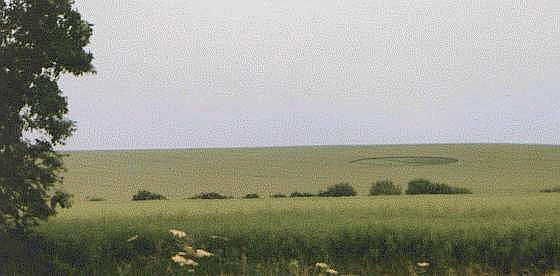 The formation is west of Huntingdon at the Spaldwick turnoff heading towards Barham. There's a single circle in a field of young wheat clearly visible from the road. The swirl was clockwise and it measured about 110' in diameter. There was a stream at the bottom of the field.