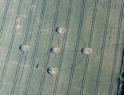 A quintuplet with a thin ring joining the satellites has appeared close to the A505 north-east of Luton. It is north-east of the junction between the Hexton road and the A505. It is on a hill side over looking the village of Lilley. It is in wheat and is about a week old. I do not have a creation date, but I believe it was reported in "Bedfordshire on Sunday". The OS map reference is TL121264. Just follow the A505 from Luton towards Hitchin, you will find Lilley easily enough. Reported by Russell Stannard.