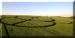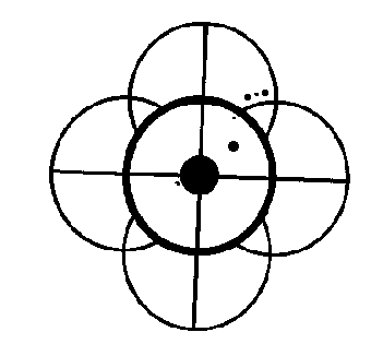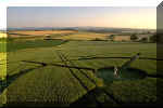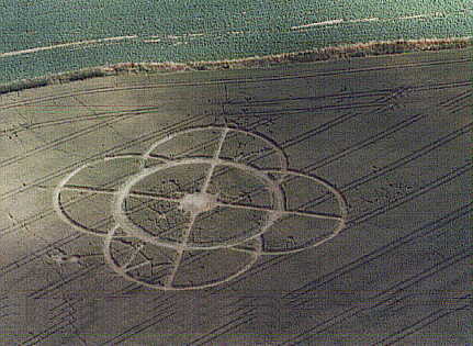 Five-Ring Cross Arrived near Yeovil, mid-July, in wheat, approx. 300 ft. across. Three grapeshot shown in made be a crude addition, or perhaps just badly damaged by visitors.