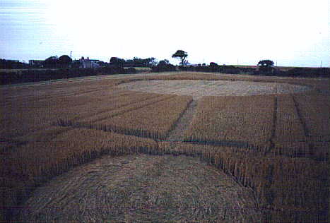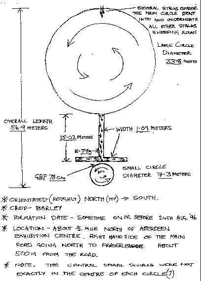 I saw a small article and photographs in the local 'Press and Journal' Newspaper on Monday 2nd September 1996. I went along to see the formation bright and early at around 7am the following day. It was very exciting as I've been following their reports this year, and certainly didn't expect to ever see a circle let alone a Pictogram!