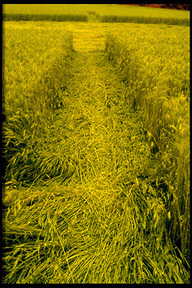 Photo E, from the same formation shows no heat disruption, a lot of mess, and note how the path does not line-up on the other end of the circle. Based on first-hand information performed the day after its appearance I have great reservations regarding its authenticity but will keep an open mind until further test results from Colin Andrews, Dr. Levengood and all other fellow researchers have been explored.