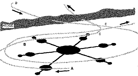The shot begins with two balls of light at A flying in a clockwise direction over the field, as if one were chasing the other. After a few seconds, when the balls are roughly at position B the central circle of the formation starts to appear, growing larger and more distinct over about two seconds. Meanwhile, the larger outlying circles start to pop up over 3 or 4 seconds. The first pair of light balls makes a left turn at C and fly through the hedge on their way off. At the same time another smaller ball of light becomes visible at D, and flying through the hedge also, it gives birth to another, even smaller light at E, and these two fly around close together like the first two. During this second stage, the smaller outlying circles appear, and the straight lines form last. Finally, the smallest light fades away as the pair fly to the right, and its partner exits frame right. The total action time is about 15 seconds, with the crop formation materialising in about five seconds. The lights appear to be about 3 to 5 feet in diameter, with a fuzzy outline. They are white, but not bright enough to illuminate the crop in the overcast morning (purple) light. Compared to the videos shot by Steve Alexander and Von Durkheim brothers, these lights are larger and flying much faster. Oddly, he makes no attempt to follow the lights on the occasions when they go off screen, but stays centred and zoomed in on the crop formation - even before it appears. Image and report by Peter R.Sorensen. Copyright 1996. Dr Eltjo Haselhoff (The Netherlands)
