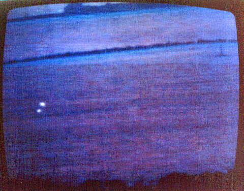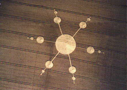 An aerial shots by Steve Alexander. Copyright 1996. The Video shows what the cameraman caught on his Video Camera after he was disturbed by unusual noises emanating from the field below. What was witnessed first were lights that were seen dancing around the field, but they disappeared and then reappeared a short time later. The second time they appeared, is when the event in question was captured on film. The witness pointed his Camcorder towards what was then an unmarked field of Wheat. As he zoomed in on the field in question in search of the lights he had seen previously, two balls of lights flew in above the crop, from the bottom right hand corner of the film as they changed direction and arced across the field. The central circle of the formation started to form in a clockwise rotation as the lights flew over it, about 30ft approximately above the crop. As the main central circle appeared the inner satellite circles formed within a matter of half a second. The flying balls of light at this stage were heading for the top hedgerow of the field as you witnessed the event on the screen. The lights were seen to fly through the first hedge and then possibly flew through the second hedgerow in the top field. The formation at this stage was almost completely finished as the outer smaller satellites connected on the pathways were made simultaneously with the pathways themselves. Once the first set of lights had departed from the area the second set of lights started to make their way across the top field. As they approached the hedgerow of the field they flew directly through it and accelerated across to the side of the formation and out of view diagonally off the screen. They returned horizontally across the formation changing direction, and swooped around the design. They departed finally to the right hand side of the screen above the formation. It seemed that the Configuration at this stage was completed. The balls of light appeared to be between 3-4 feet in diameter, some were brighter and larger than others. The first pair followed the same flight paths, while the second pair separated for a short time from each other, then continued together again. The estimated speed of the lights could have been 80 to 90 miles per hour, and the whole length of the Video Footage including the lights and the formation forming was approximately 17-18 seconds. The whole event of the formation forming appeared to be simultaneous. What we have just described is a breakdown on the circumstances of the Video footage to our best abilities. We will add a second report of the video footage by another person and "we hope" some stills of the video within a few days. Report by Stuart and Mark Fussell. The Crop Circle Connector. Six Still from the Video Footage