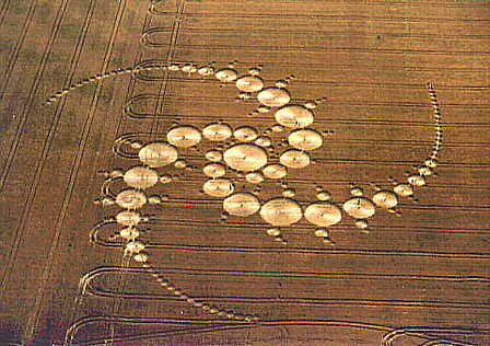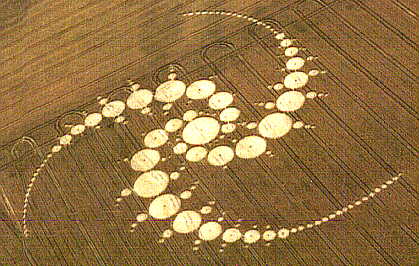 This most spectacular formation yet appeared North-West of Avebury on July 29th. The Diameter is probably more than 500 feet. The crop is wheat. It has a record 194 circles; the one with the "S" has a beautiful reversing swirl. A thin underlying construction line occasionally comes up over the lay of the circle. This diagram is based on aerial observation, not a ground survey. It is the most difficult I've ever done!