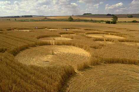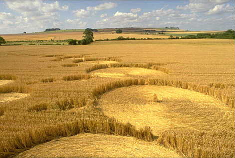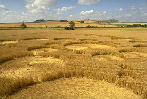 Each circle was separated by standing crop, just like the Stonehenge formation, until you reached the smaller diminishing circles which flowed into each other. The smaller circles were fascinating, as bunches of crop were forking into the surrounding wall of the circles. Each bunch was overlaid on top of the next, as if it was flattened in stages, instead of one overall movement.