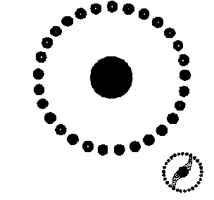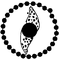 South-east of Winchester Where? Barley? 80 feet diameter. The Crop in the central circle had a rare radial (no swirl). Many of the outer circles had standing centres with as little as a single standing stalk (white dots). (Two horrible-looking "Galaxy" arms made of squiggles curved out from the centre. Extremely crude compared to the circles, they were almost certainly not part of the original. Depicted at right for the record.) © 1997 Peter R. Sorensen. |
