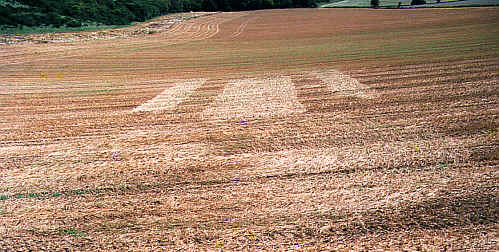 There were actually three. The third, smallest, formation was right in the westernmost corner of the field and was probably not visible from the hillside. First to appear was the "axe-head"-within-circle, followed a couple of days later by the two "spaceship" pictograms. The location is properly known as "The Gliders". The farmer gave permission for a survey on the understanding that this would be put on record in exchange. He was very emotional about the subject, since the hill was used by both British and German glider pilots for training in the pre-Second World War years, and several lost their lives there.