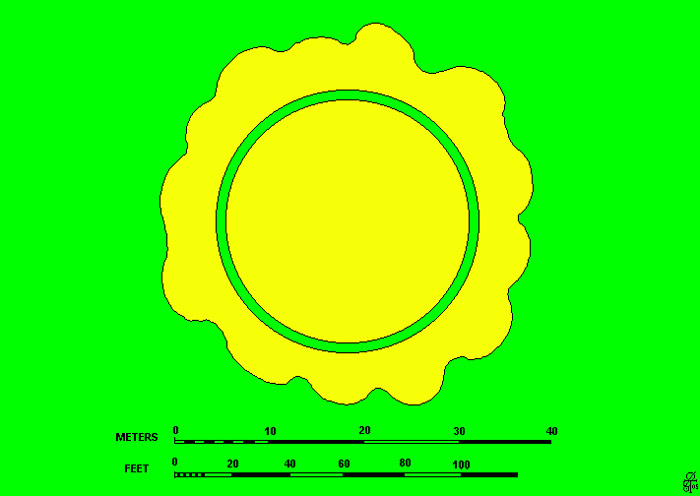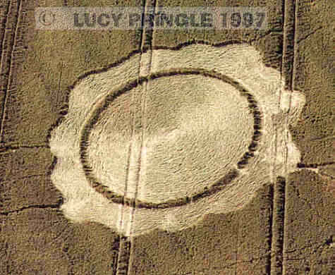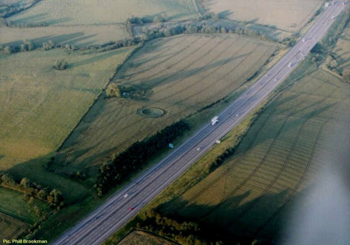 An aerial shot by Lucy Pringle. Copyright 1997. For Cosford you will need an Ordnance Survey map. From the Landranger series, it looks very much like a collection of about five houses.. The formation itself is on the north side of the M6 about 1/2 mile west. It is on the side of a hill and clearly visible from the motorway when travelling towards Birmingham. I did have a map reference, but having seen the location of the formation I suspect that it is wrong so I will go again from a map. 40m (approx.) circle with fat ring around. Very visible from junction 1 slip road and looks well laid. The formation is not visible from surrounding landscape. The farmer is not allowing access to the site and most public footpaths are either overgrown (!!) or unmarked on the ground(!!!). Possible M.O.D. land around field?? Photograph from motorway to follow. Report by Anthony Harding