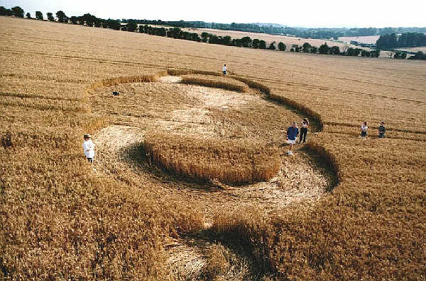 Near Lane End Down, Hants, in wheat, July 12th, 100 feet, Unusual, nearly-radial lay of central circle looks very nice from the air. Many researchers praised its details on the ground too.