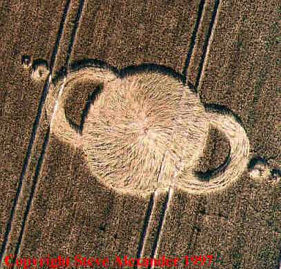Id like to report a new (12/7) formation at Lane End Down nr Winchester. It is a `solid` circle with two 3/4 circles at opposite sides each of which are tailed by 2 smaller circles slightly offset from them. The smaller circles have tufts in their centres. A picture is on its way to you.