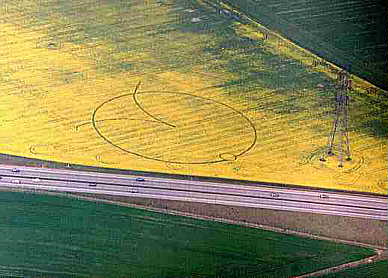 * To get an idea of the size of this Formation: It spans over 9 tramlines. If the width of each is only 40' (they can range between 26'-60'), the diameter is a minimum of 360'. * The Ring is in flowering Rape seed - a beautiful and delicate flower. * The centre of the small Ring is *between* the tramlines, and in this photo appears completely undisturbed - which it definitely would not, had someone used it as the point from which to mark out the circumference. Thank you, Paul Vigay The formation is actually outside Saffron Walden, although I suppose Cambridge is quite close at eighteen or so miles up the M11. People have asked which direction north is in. The power lines in the photograph run about 5 degrees east of north south and the formation is on a south facing slope. Stems were kinked near the ground, quite a few broken. Flowers were growing up though, even on the broken stems. It was too dark at the time I was in the formation to see the state of the plants properly. Report by Russell Stannard. |