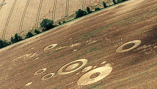 This formation was made July 21st by two German researchers, Joachim Koch and Hans Kyborg, "in co-operation with the CircleMakers." They dowsed the field, and marked the energy points with the circles. The resulting design is a star map which will reveal the Circlemaker's origin. 14 year-old Sara Bailey's horse acted strangely when riding by the field after dark, and she told her friend she was sure there was a crop circle in the field. I am quite interested by the interaction of people with the Circle making intelligence, and I feel there is something telling about Sara`s experience - it may be more than coincidence.