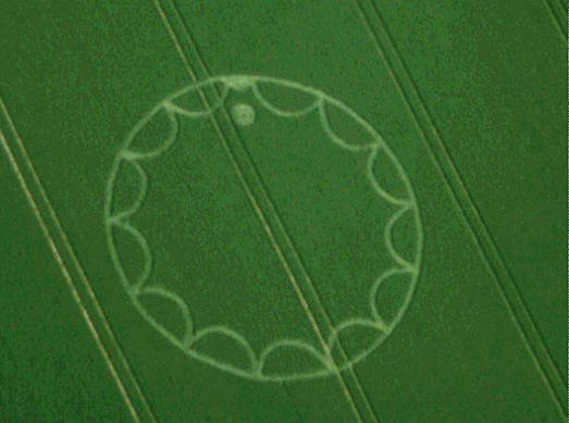 This formation consists of a clear-cut ring with thirteen arcs around the inner circumference, giving it the appearance of a pastry-cutter. At one point on the circumference the arcs are interrupted by a small semi-circle, with a further small circle aligned with this and a few feet in towards the centre of the main ring.