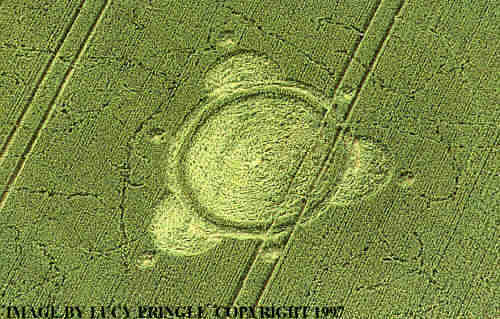 This barley formation, discovered in Late June is only about 60 feet on a side. After inspecting the crop and dowsing the circles, Richard Andrews, said "Its a cracker!" The design, while original, has the classical crop circle look.