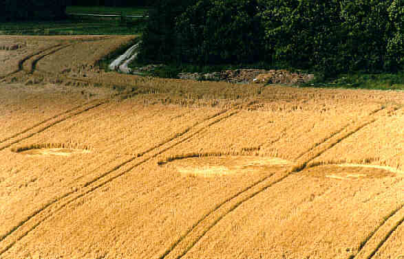 This area just outside of the market town of Marlborough has seen a number of formations over the last seven years, probably the most significant and spectacular was in 1991, when a 300ft+ triple dumbell appeared on the slopes of Rough Down. This year a scaled down similar version has appeared, on one of my favourite fields in the Avebury area.