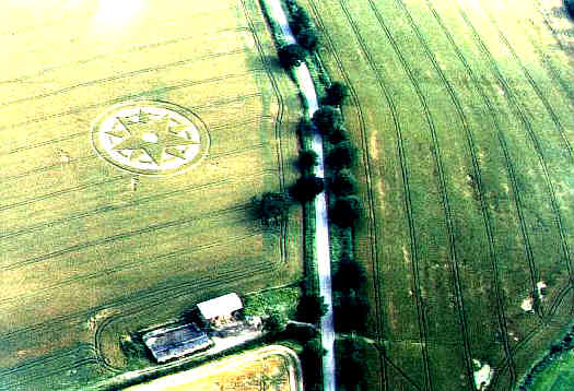The series of pentagrams that began with the 1993's "Bythorn Mandala," returned with last year's "Hopi Star," and again this June at Beckhampton, continues with this powerful white/black magic design, July 4th at Dadford, Buckingham. The 190 foot diameter design, in wheat has two immaculate little signatures, which thrill some researchers, but look very suspicious to others.