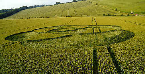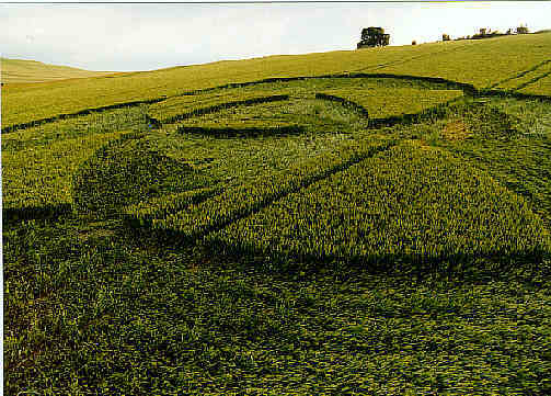 This formation arrived north of Alton Barnes near the Wansdyke in wheat. This formation has four grapeshot, with the plants bent halfway up the stems. This formation has identical geometry to the Ivy House Farm, Fyfield, nr Marlborough, Wiltshire. Reported 21st June (a sub-set of 1994's "Flower of Life" formation), but flattened and standing areas of crop have been reversed.