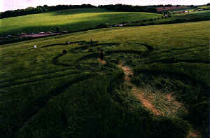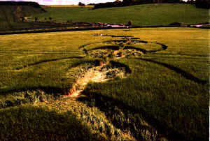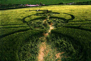 Located at the junction towards Alton Barnes, and the village of Lockeridge, is another formation, placed only a few hundred yards from the East Kennett design on the other side of the hill. Its design resembles a Caterpillar, or possibly the return of the Scorpions?. There are six circles in total making the entire body, with a large crescent design placed at the very top. This feature is handed on its tail at the other end. Placed within the middle, are four standing tufts of crop, two in each of the central circles. Connecting the two central circles are two handles placed either side.