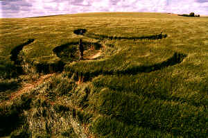 Many of the circles were flowing in an anticlockwise rotation, I can't comment for the very top circles. Is this design the start of the return of the insects shapes seen in the early nineties. Its has similar overtones to the 1994 formations. That can also be said for the Newton St. Loe 2nd event, of this year. An intriguing start to 1998, with some interesting connections to the formations we have seen so far.