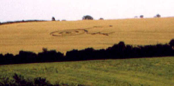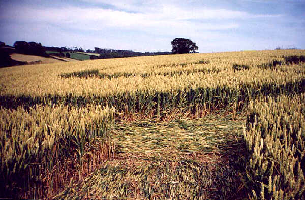 ![]() A relative in the area knowing my interest in crop circles, telephoned me, to tell me that there had been a formation at Axmouth that weekend. As I had a couple of hours on my hands I headed down to see it. After some time I found the circle in a large wheat field. It was clearly visible from the narrow lane east of Axmouth.