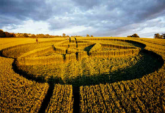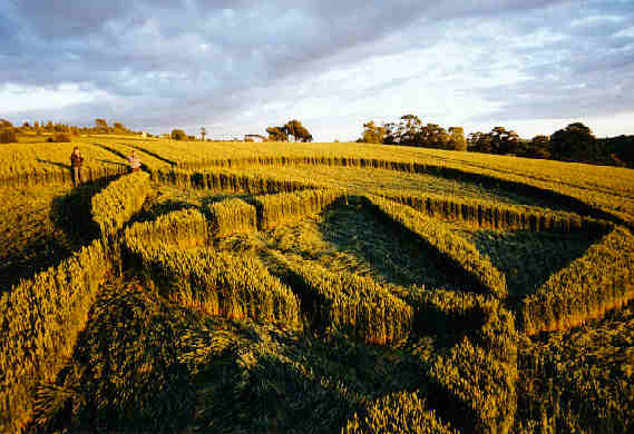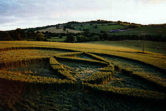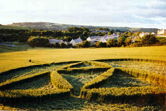 Pole shots by Stuart Dike Copyright 1999 Click on Thumbnails to enlarge Only a couple of days after the Marksbury formation, we heard of another formation below the slopes of Penny Quick Hill, nr Combe Down in Bath. This was the location for the Oil Seed Rape circles from last year, and was almost placed in the exact same position in the field as those circles. This latest formation was most definitely a contemporary of the Marksbury formation, with further additions. This time, we have a cluster of joined triangular sections placed in the central part of the overall design. Its outer merged circles are the same as the Marksbury formation, and are both on a similar scale. Again this land belong to the Duchy of Cornwall, who is in fact Prince Charles. We are unsure if he is aware that he has quite a number of formations on his land, but he may find them of interest. The design on Penny Quick Hill was very well constructed, and has the same feel as the Marksbury event. As I write this report, further designs have appeared in the general area, based on similar theme, with triangular sections included. Report by Stuart Dike |