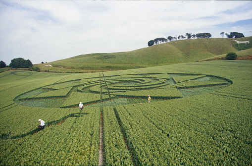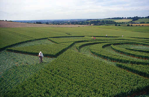 Pole shots by Stuart Dike Copyright 1999 Click on Thumbnails to enlarge Located directly below the famous White Horse of Oldbury Camp, or more commonly named Cherhill Hill Fort, is one of the finest formations to have appeared in the Avebury area this year. Its appearance came within a flurry of reports that hit the area between the 15th of July to the 17th. The entire week was one of the quietest we have experienced at this time of year, but none of us expected such an amazing amount of formations within just a few days. The Cherhill formation incorporates a design, which has similar elements to pervious formations in the general area. We are looking at a much smaller pattern to what appeared at Hackpen Hill a few weeks earlier, but the central section of the Cherhill design includes a number of crescents creating a vortex, which is also present within the Hackpen formation. The floor constructions on these years formations have been extremely impressive, and Cherhill was no exception. The pattern around the triangular sections on the outside of the vortex flowed in two directions between each interlocking triangle. This is a feature seen on many designs over the years, but the Cherhill formation incorporated a separate pattern positioned just off the main design. This shape is not the first time to have appeared; it was first seen on the Silverstone formation in Derbyshire back in 1998. It includes a small fork with a swirled central circle with standing crop, and a small tail at the end. On closer inspection of this small pattern, it contained an extremely important detail, which needs to be published. Looking at the central swirled section with the standing crop placed in the middle, on the outer edge of the standing stems, there were about 8-10 stalks, which were completely bent over at the very top of the plant. Not only that, but the stems themselves had discoloured to a brownish colour, which resulted in the seed head being completely dehydrated, with about half and inch of stem included.