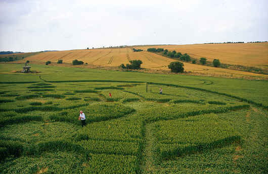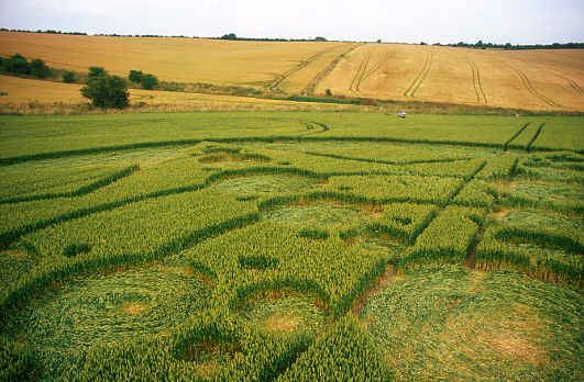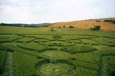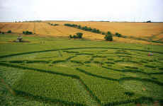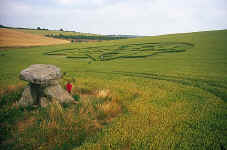 Pole shots by Stuart Dike Copyright 1999 Click on thumbnails to enlarge. Many formations this year, will be remembered for their shear size and complexity, but this design, located well away from the busy A4 road to Marlborough, will remain very special to the people who visited it. The question to why this formation stands out from the rest is quite simple, because the three major rules have all been fulfilled on the Devils Den formation. Design, Position, Location. These are the three fundamental aspects to Crop Circling, to make your visit to a formation enjoyable. Luckily this year, many of the formations have been located in wonderful locations, but to have a design positioned next to an ancient Dolman, in quite a tranquil place, and with a breathtaking pattern, combines everything for a memorable experience. The ancient dolman, is situated in a piece of landscape which rarely sees a human face, only now and again, this wonderful set of three stones, with a top lintel will have the Farmer to keep it company. The majority of the year, it stands alone, away from the crowds of Avebury. However, 1999 has put this location back on the map, for the crop circle community. The formation itself is positioned within a slight dip in the field, on a gentle incline. The pattern is only about a 100 feet away from the Dolman, (see pole images) but is in a direct line along the field. (See pole shot behind Dolman). The Crop Circle Connector was very lucky to see the formation when it was only a few days old, not many people has visited the formation, as its situated about a quarter of a mile away from the A4 road. On entering the design, its floor construction was simply beautiful. There were some wonderful small 2-3ft channels running around the outer perimeter crop, which indicates a Wind Tube effect. On inspecting the many circles inside the formation, I noticed that all of them were running in a clockwise rotation, but on closer inspection, it would seem that the smaller outer circles running down each diminishing arm were not quite circular in form. Some had almost a Triangular and Rhombus shape, which meant that the crop was slightly pointed on one side, but a few still retained a their circular shape. The very night this formation formed, a power failure was experienced by the local residences, between 11-1pm. This would be around the time that the formation could have been forming, and must be included within this report, as the two events may have been related? However, it remains a classic example, on what can sometimes occur around the appearance of the crop circles. Reported By Stuart Dike. |