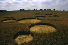Pole shots by Stuart Dike Copyright 1999 Click on thumbnails to enlarge. The fields that cover the area on the top of Lurkley Hill have seen a number of different types of formations since the days of 1991. This latest shape, may just well be a culmination of a sequence of three formations that have been forming since Allington Down, on The 26th of June. Rockley was the second sequence, which appeared on the 10th of July, and now we have the third and possibly final design at West Overton. The design itself appears to be a DNA strand, incorporating three arms, but this latest shape includes and extra set of two arms on each of the main arms coming off the central point. This is certainly the most elaborate, and largest of the three, and could be hinting at the lost section of a DNA which maybe finally returning to our system? A combination of different sizes of circles were found in this latest pattern, which was more of less the same for the previous two, that appeared earlier in the season. The largest circle was of course the central circle, which had a diameter of 32ft. The crop was flowing in an anti-clockwise rotation. The three arms branching off, from the central circle had variable sizes of circles. If we concentrate on two of the arms, starting with the eastern arm first. The first circle had a starburst centre, with a clockwise rotation. Second circle had a clockwise rotation, third circle was anti-clockwise, and the forth circle clockwise. The fifth circle had an anti-clockwise rotation, with again a starburst centre. Each of the smaller arms branching off, had similar sizes of circles, but the second circle on each of the smaller branch arms was the only one to have an anti-clockwise rotation. The rest of the circles included clockwise lays. The first circle off each of the three arms was approximately 20ft in diameter, the second circle coming down to 10ft. The third circle was around 9-10ft also, and the fifth circle off, was again similar in size to the first at 20ft in diameter. There were 40 circles in total, 13 on each arm; (this figure includes the smaller branch arms). Reported By Stuart Dike. |