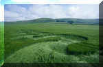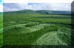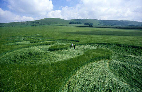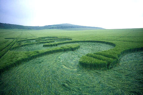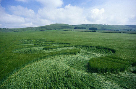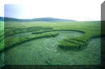 Pole shots by Stuart Dike Copyright 1999 Click on thumbnails to enlarge. This formation is placed some six tramlines towards Woodborough Hill, further down East Field, and is of a completely different design to the pictogram. Furthermore, it has a floor pattern that is completely different in nature to the longer pictogram. The design is very similar in appearance to the Barton St Clay formation back in 1996, with snaking pathways, and an arrow head, strangely pointing toward the pictogram. It's interpretation is the Sun Serpent from South American culture. The serpent's floor pattern was extremely interesting, placed at the very top of the design, it had wild grass growing within the crop, which was partially effected, partially standing. It is separated the top head section, from the first snaking pathway. Overall, it had an impressive floor lay, with a wonderful fluidity, and some very nice splayed sunburst centres, placed at each intersections. There are two major directional flows involved in the overall creation of the formation, which intersect down the main axis. Report by Stuart Dike. |