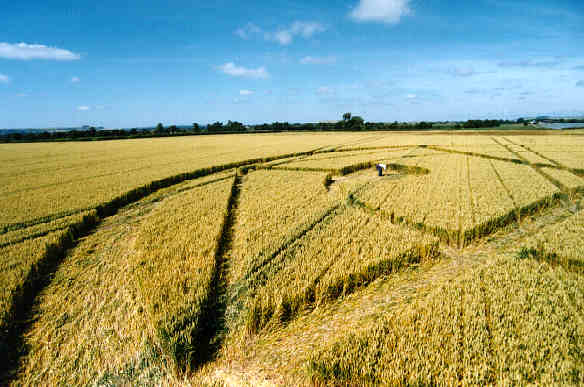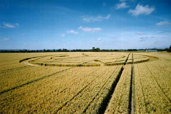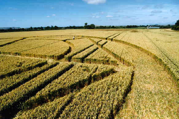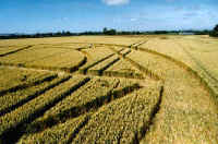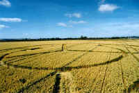 Pole shots by Stuart Dike Copyright 1999 Click on thumbnails to enlarge. This formation is close by to the famous crop Circle public House The Barge at Honey Street and from first reports it is another Cube like formation. The season of 1999 will be remembered for many things about the formations, but one aspect will be that it was the year of the Cube. This is the second major formation to include a Cube design; the first was at Allington some four weeks before. It's position within the field meant that you could actually see it from the Barge Inn Camp Site, about 500 yards from the formation. Short walk down the Canal and you would come across a design, which included a three, dimensional Cube, (floating) with a sphere placed inside. What was so interesting about this design, was that it only worked from one particular point of reference seen from the air. Placed at what appears to be the top of the formation, is a small avenue coming off the outer perimeter of flattened crop, which then appears to penetrate the sphere inside, creating a semi-circular design. Turn the formation upside down, and the design doesnt work (as seen in our own aerial images). As you are now aware, I made reference to the work of Escher within the Allington formation, but this Cube and Sphere moves away from his work, as you can only view the formation within its intended three dimensional perspective. The radius of the semi-circle placed within the Sphere, is 20ft, with a clockwise rotation. The avenues that make up the cube and the sphere are all the same width, which are 3.5ft. The outer ring surrounding the central design is 10.5ft in width. The inner ring creating the Sphere has a clockwise rotation, with the entire cubes avenues running in also a clockwise direction. This design I felt, only worked from the air, as the ground shots dont unfortunately do it justice. The question is now, how will they elaborate on the Cube concept, and what does it actually represent? Some people actually believe, we are moving into a different dimension of experience. Reported By Stuart Dike |