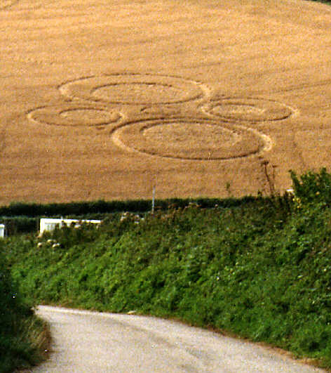 I didn't enter the formation (prominent "keep out" sign on the gate) but I would guess it was in the region of 250ft across. Hard to tell what the design was but it certainly looked somewhat "eclipse inspired", and its location would have placed it in the path of totality. No sign of access to the formation, but oddly enough there was some very heavily trampled "tracks" running diagonally straight across the field... but notably not intersecting the formation. I've never really seen this before in a field, but I presume caused by animals? While there I was told that a number of helicopters had hovered over it the following day