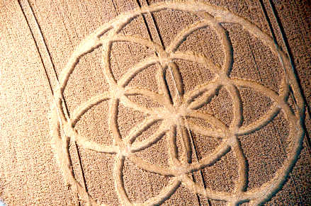 This 166 feet wide formation, first reported on Sunday 13th August, lies on the Pilgrim's Way within a hidden field of ripened wheat, which any day now will receive the attention of the Grim Reaper! It's a 'Flower of Life' design surrounded by the 6 rings which create this piece of sacred geometry.