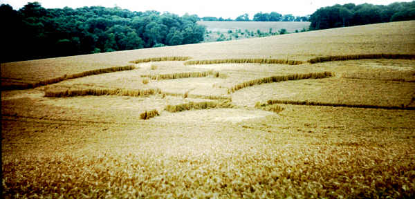 flattened wheat were observed. A 10ft wide straight path lead directly from the very centre of the formation to the edge of the field, a distance of 500ft. This had the