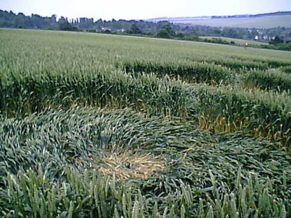 tramlines where these bisected some of the circles, forming a thin curtain of stems across part of the circles. The crop had been heavily laid beneath
