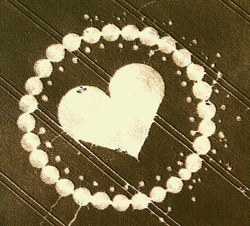 On closer inspection, this new formation was very different from the first, with a very unusual heart shape made up of three linked circles, encompassed by 29 circles. All of the circles, excluding the heart inner circles were flowing in an anti clockwise rotation, with just one circle on the outer ring significantly smaller than the rest. The circles inside the heart, were all flowing clockwise. On the bottom side of the formation, towards the long barrow, a number of random grapeshot circles were dotted around the outer ring of circles. But curiously, none were present on the upper part of the formation.
